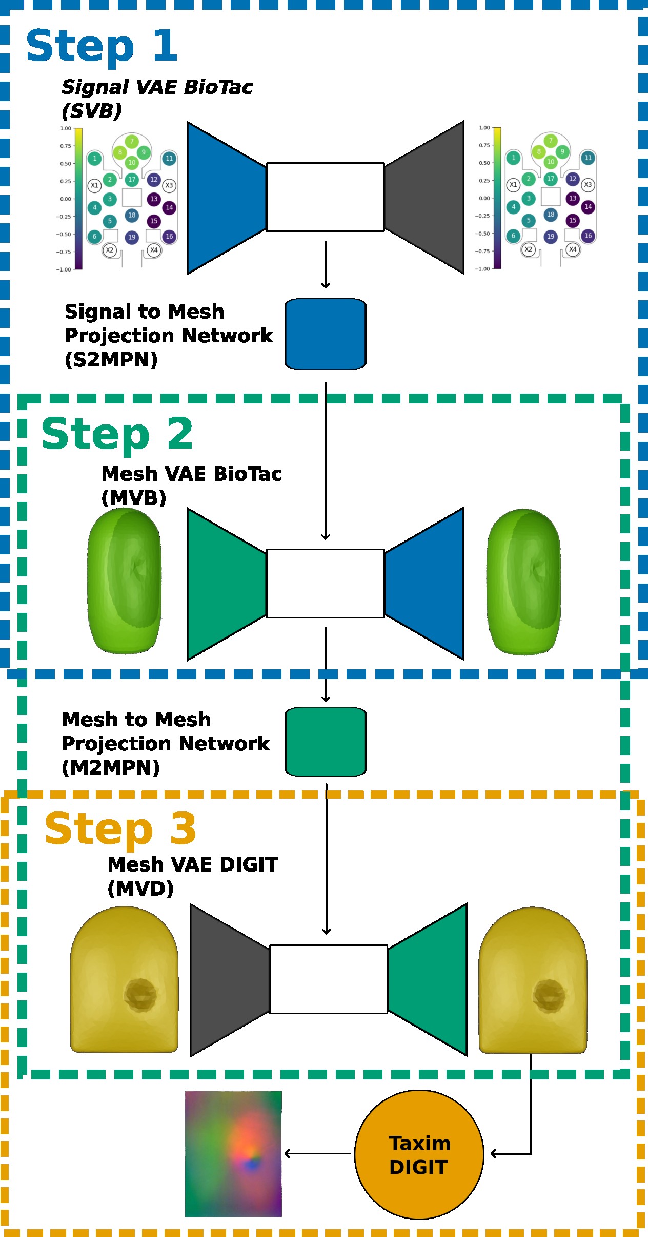 Next, we translate the BioTac surface mesh deformation to the DIGIT sensor’s surface mesh deformation. This is possible because the physical interaction between both sensors can be modeled through mesh deformation, regardless of their different sensor output modalities.